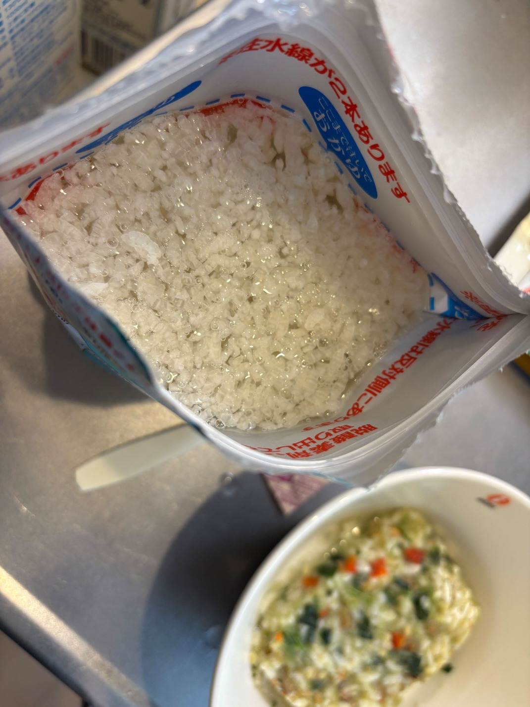 スタンダード白飯くんは、おかゆになっていただこう。おなかすいたのでお湯。