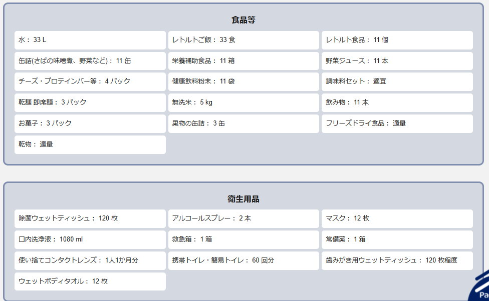 ⇧のサイトで、家族構成をいれたらおすすめの備蓄リストをだしてくれるらしく、やってみました。