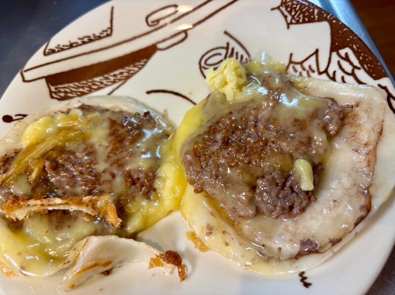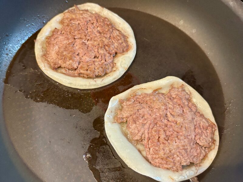 牛豚ひき肉を餃子の皮にのせて、ぎゅっとして、じゅっと焼いて