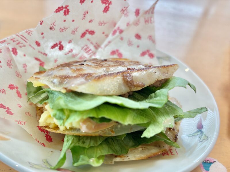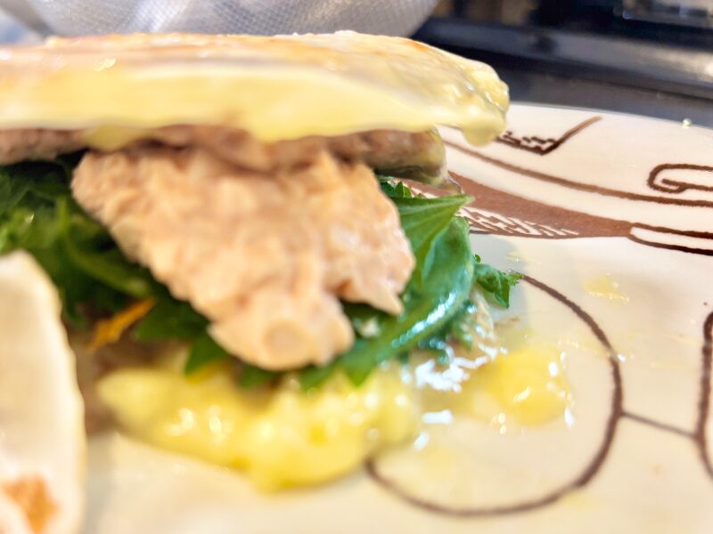 (・・・・レタスがワイルドすぎるな~。最初の方にめくったのを手でちぎって挟んだ感)