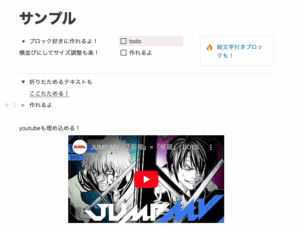 どのくらい自由かと言うと、シンプルなテキストからチェックリストから折りたためるテキストから見出し的なブロックから多様なブロックを幅も数も好きに並べまくれたり、