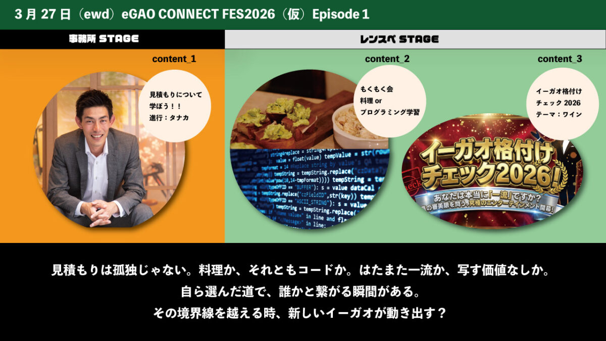 その第一弾が、3月のeWD(eWorkDay)で実施する 『eGAO CONNECT FES2026(仮)Episode1』 です!