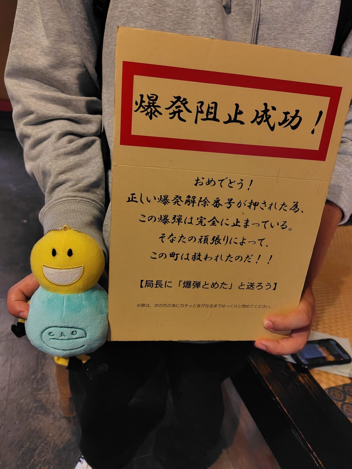 江戸の町を堪能していたら、なんと謎解きイベントをやっているのを発見!園内いろんなところにちりばめられたヒントを探して謎を解きながら物語を進めていくんだけど、これがなかなか大変で楽しい。無事に謎解きを成功させて、爆発事件を阻止しました!